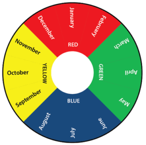 An easy way to remember the periods is each colour corresponds to one of the four seasons.